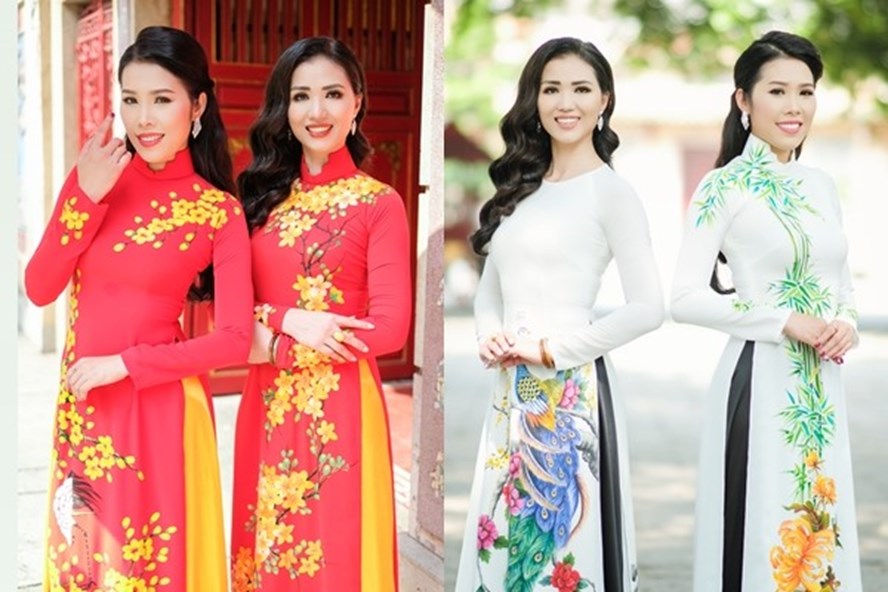 Với bộ áo dài đỏ họa tiết hoa mai vàng, Thụy Oanh – Thu Hằng khiến người xem cảm nhận rõ hơn về không khí xuân đang đến gần. Thiết kế có màu sắc nổi bật tôn lên vẻ quyến rũ, sang trọng cho hai người đẹp. Màu đỏ cũng là màu đặc trưng cho lễ tết, biểu tượng của sự may mắn, tài lộc đầu năm.